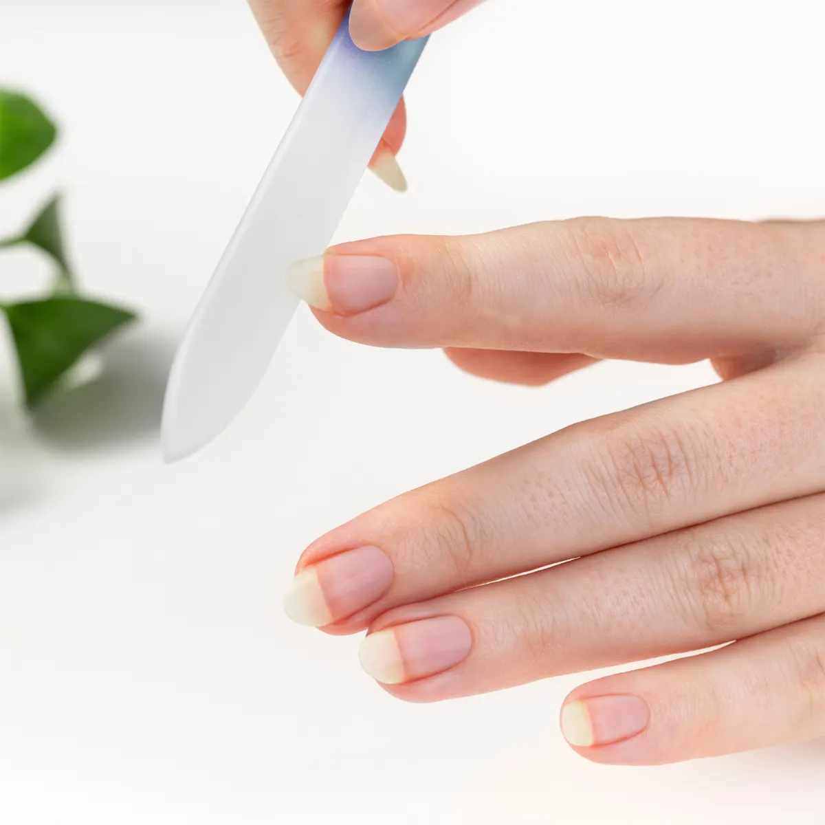 Etched glass glides across natural, brittle, or damaged nails without harsh grit or pressure.